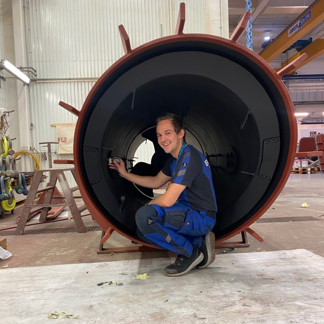 – Jeg jobber i en bedrift som produserer fremdrifts- og thrustersystemer til ulike båter i forskjellige segmenter. Min arbeidshverdag går i grove trekk ut på å sandblåse og prime komponenter og produkter til produksjonen. Det innebærer alt fra små ståldeler og helt opp til tunneler, som kan være i overkant av 3 meter i diameter og opp til 13 meter lang. Når disse er ferdig montert, kommer de tilbake til oss for videre behandling. Da starter vi med avfetting og vasking. Når det er gjort så står maskering for tur, og så påføring av kundens spesifikasjon og krav til prosedyre. Her varierer det hvilke malingstyper kunden ønsker. Noen ganger ønsker kunden at thrusteren skal leveres med bare en primer, og andre ganger så ønsker de at det skal bygges opp et fullt malingssystem, gjerne bestående av 4–6 malingsstrøk av forskjellige typer maling. Mellom hvert strøk må vi gjøre noe som heter stripe coating, det vil si at vi bruker pensel for å male sveiser, kanter, hjørner og alle de stedene som er vanskelig å komme til med sprøyte.